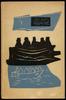mb Vorm schuit(blauw) daarin vierkant vlak(zwart) met uitsparing en v/e schuit met 4pp. m Vorm schuit met 5pp(zwart) gedeeltelijk daardoorheen een vlak(blauw) met uitsparingen v/e schuit met 7pp en golven. Tekst en foto's(zw/w) binnenzijde.