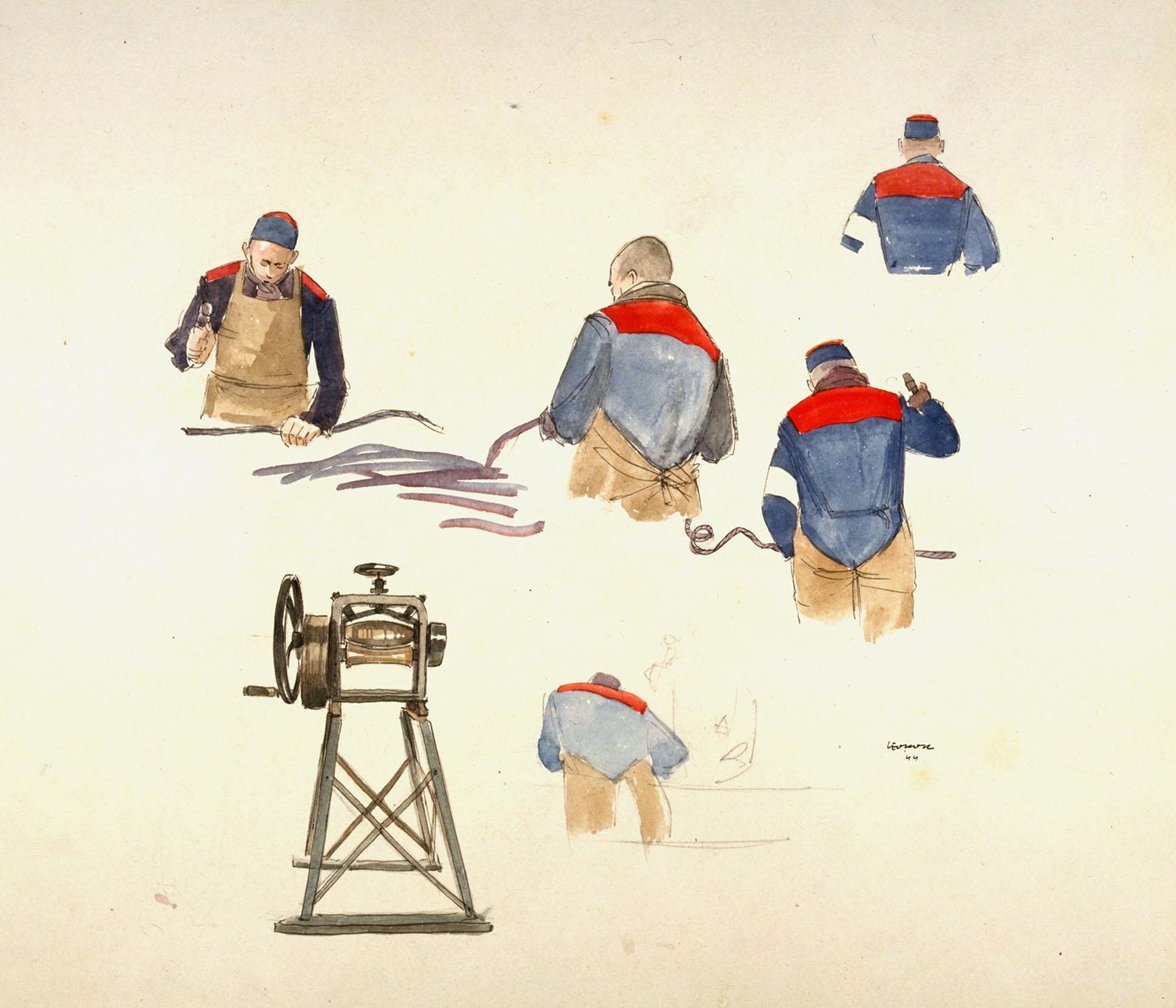 Vijf studies van een strafgevangene, vier keer op de rug gezien, een keer frontaal, die bezig is met het ontmantelen van kabels. Linksonder een mangelwerktuig waarmee het koperdraad werd geplet