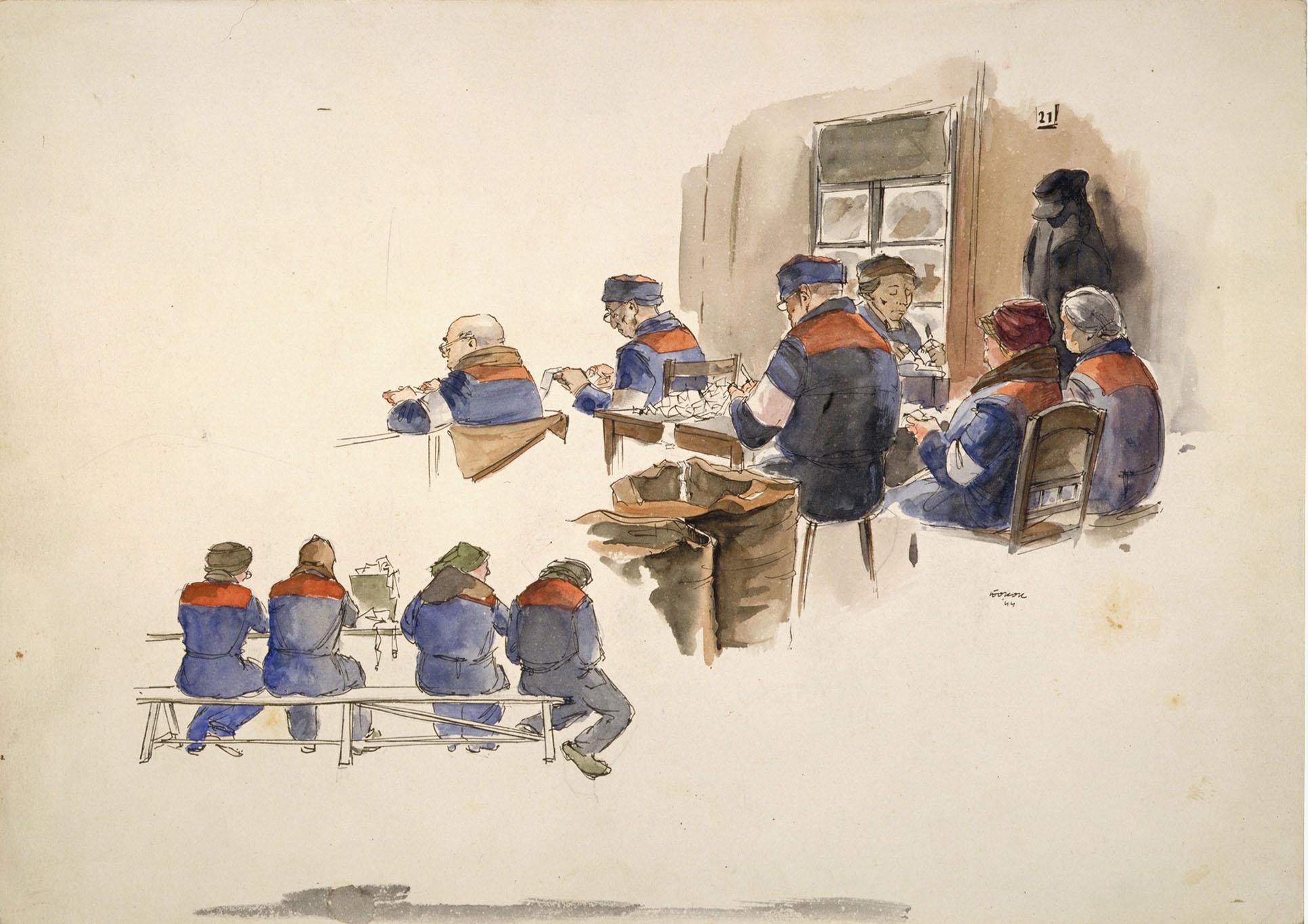 Twee studies van twee groepen strafgevangenen die zilverpapier aan het splitsen zijn. Rechtsboven vijf personen ter halver lijve zittend met de rug en trois quart naar links, een persoon met het gezicht en trois quart naar rechts. Linksonder ter halve lijve zittend met de rug frontaal, op een bank aan tafel. Allen dragen de blauwe overall met de rode schouderstukken.