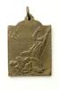 Rode duivel met puntbaard zet zijn klauwen in de schouder en op het hoofd van een man met baard, en profil naar rechts.