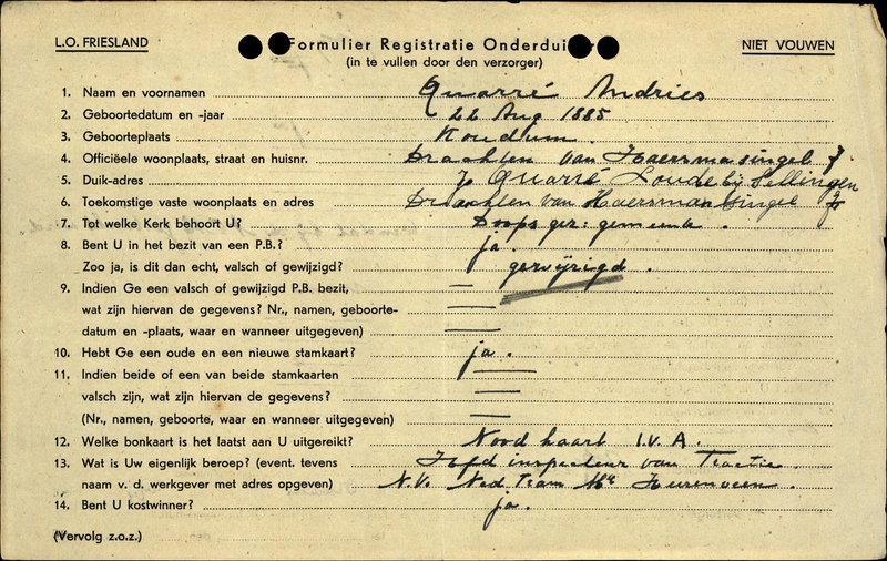Duikadres: Laude (Gem. Vlagtwedde) - Oorspronkelijk adres: Van Haersmasingel 7, Drachten - Reden onderduik: staking - Overige opmerkingen: Bijzondere opmerkingen: De laatste twee maanden was ik thuis ondergedoken.