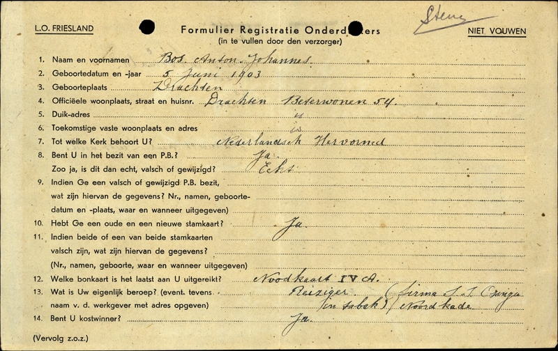 Onderduikinschrijving van Anton Johannes Bos