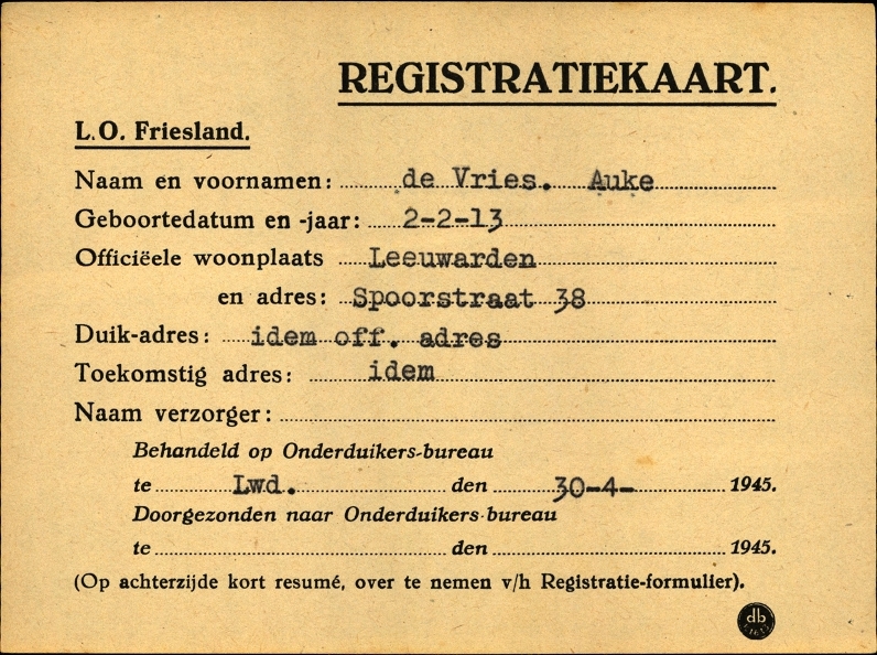 Duikadres: Spoorstraat 38, Leeuwarden - Oorspronkelijk adres: Spoorstraat 38, Leeuwarden - Reden onderduik: anderszins - Overige opmerkingen: Achterkant bijzonderheden: Geen P.B., wel Stkrt. - Achterkant beroep: Bouwkundige