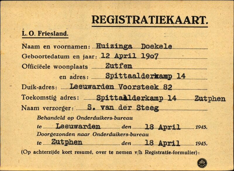 Onderduikinschrijving van Doekele Huizinga