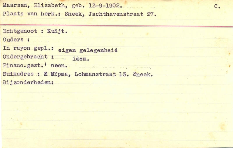 Duikadres: Lohmanstraat 13, Sneek - Oorspronkelijk adres: Jachthavenstraat 27, Sneek - Overige opmerkingen: Bijzonderheden: In rayon geplaatst en ondergebracht:eigen gelegenheid