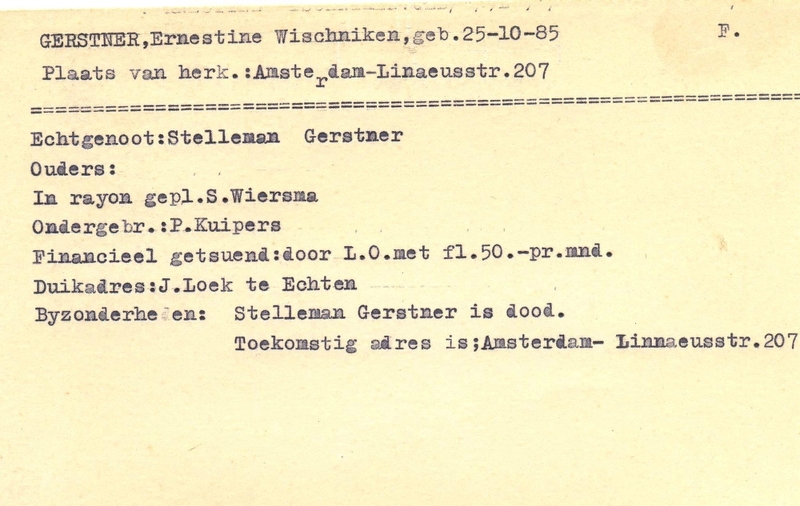 Duikadres: Echten - Oorspronkelijk adres: Linnaeusstraat 207, Amsterdam - Overige opmerkingen: Bijzonderheden: Financieel gesteund: door L.O met fl. 50.- pr.mnd Stelleman Gerstner is dood.