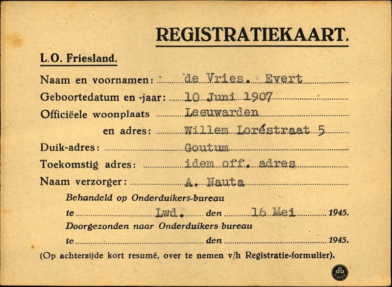 Duikadres: Goutum - Oorspronkelijk adres: Willem Loréstraat 5, Leeuwarden - Reden onderduik: anderszins - Overige opmerkingen: Achterkant bijzonderheden: ondergedoken wegens vlucht uit Dtsl. - Achterkant beroep: transportarbeider