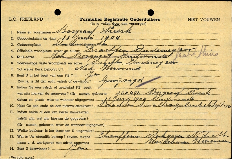Duikadres: Oudwoude - Oorspronkelijk adres: Oudeweg 205, Drachten - Reden onderduik: staking - Overige opmerkingen: Bijzondere opmerkingen: gewijzigde P.B, chauffeur N.T.M Heideburen Heerenveen, werd doorbetaald t.e.m 13apr.1945,kan terugkeren in betrekking, geen beslag op woning kan na oorlog weer beschikken over woning.