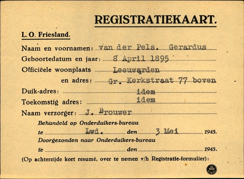 Duikadres: Grote Kerkstraat 77 boven, Leeuwarden - Oorspronkelijk adres: Grote Kerkstraat 77 boven, Leeuwarden - Reden onderduik: anderszins - Overige opmerkingen: Achterkant bijzonderheden: ondergedoken wegens hul[p] aan Joden. Met geheele gezin ondergedoken in Amsterdam, laatste tijd weer in Lwd. teruggekeerd. - - geen P. B. wel stkrt. - Achterkant beroep: stoker-huisknecht