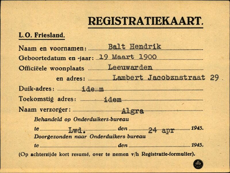 Duikadres: Lambert Jacobzstraat 29, Leeuwarden - Oorspronkelijk adres: Lambert Jacobzstraat 29, Leeuwarden - Reden onderduik: arbeidsinzet - Overige opmerkingen: Achterkant beroep: Meesterknecht - Achterkant naam werkgever: -