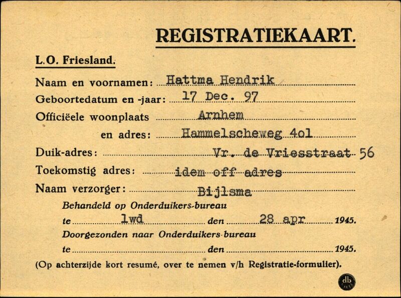 Duikadres: Vredeman de Vriesstraat 56, - Oorspronkelijk adres: Hommelseweg 401, Arnhem - Reden onderduik: staking - Overige opmerkingen: Achterkant naam werkgever: NS