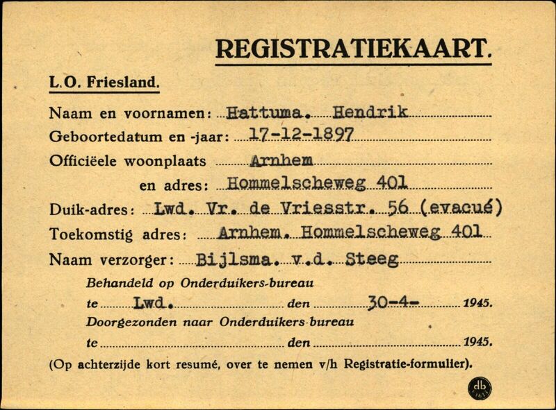 Duikadres: Vredeman de Vriesstraat 56, Leeuwarden - Oorspronkelijk adres: Hommelseweg 401, Arnhem - Reden onderduik: staking - Overige opmerkingen: Achterkant beroep: Adjunct Commies - Achterkant naam werkgever: Nederl. Spoorwegen