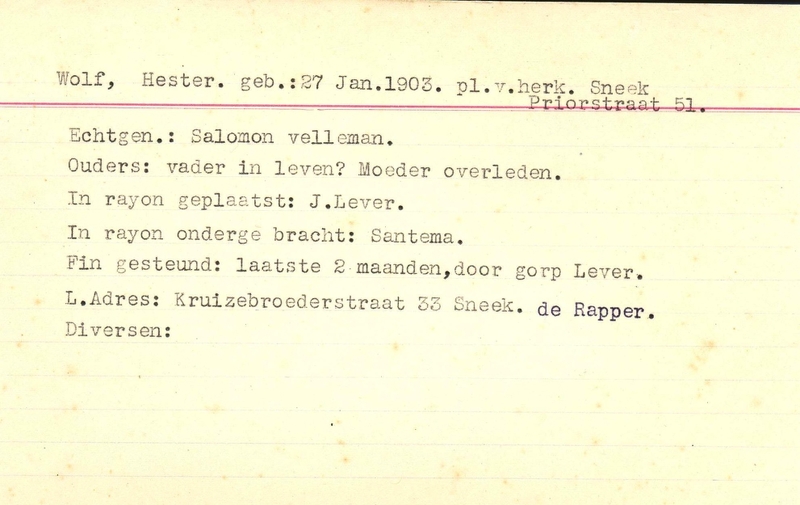 Duikadres: Kruizebroederstraat 33, Sneek - Oorspronkelijk adres: Priorstraat 51, Sneek - Overige opmerkingen: Bijzonderheden: Ouders: vader in leven? Moeder overleden. - - Fin. gesteund: laatste 2 maanden door groep Lever.