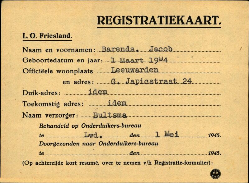 Duikadres: Gysbert Japicxstraat 24, Leeuwarden - Oorspronkelijk adres: Gysbert Japicxstraat 24, Leeuwarden - Reden onderduik: arbeidsinzet - Overige opmerkingen: Achterkant bijzonderheden: ondergedoken wegens vlucht uit Duitschland (was met verlof en is niet teruggekeerd). geen stkrt. - Achterkant beroep: kantoorbediende