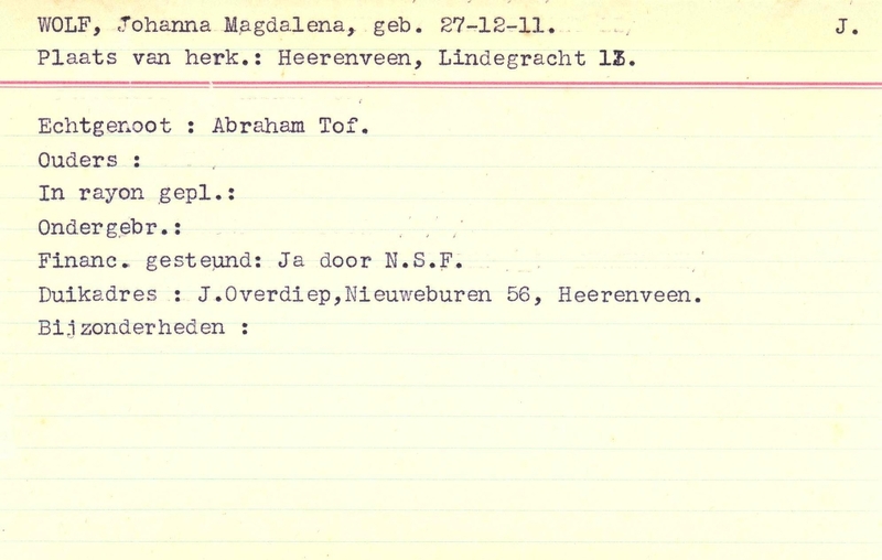 Onderduikinschrijving van Johanna Magdalena Wolf