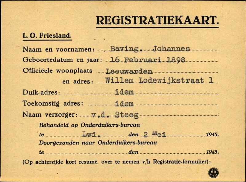 Duikadres: Willem Lodewijkstraat 1, Leeuwarden - Oorspronkelijk adres: Willem Lodewijkstraat 1, Leeuwarden - Reden onderduik: arbeidsinzet - Overige opmerkingen: Achterkant bijzonderheden: Wel stkrt. - Achterkant beroep: Musicus - Achterkant naam werkgever: -