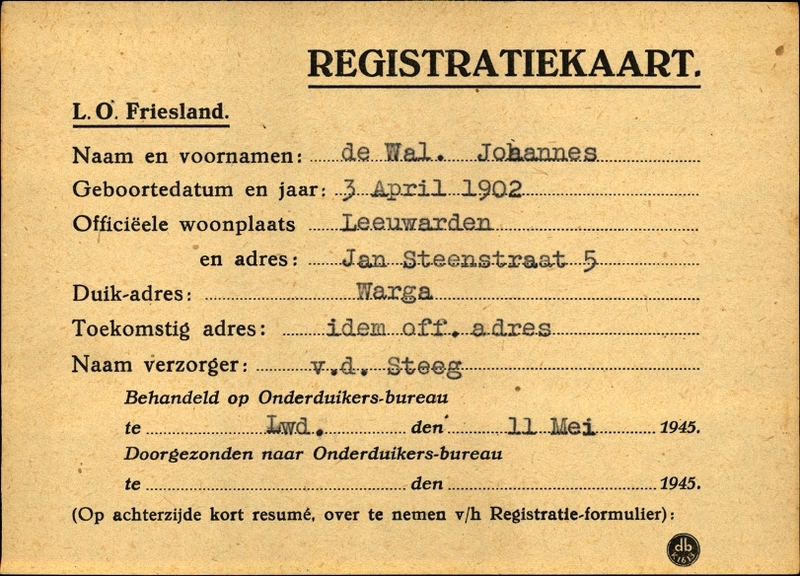 Duikadres: Warga - Oorspronkelijk adres: Jan Steenstraat 5, Leeuwarden - Reden onderduik: staking - Overige opmerkingen: Achterkant beroep: ondermachinist NS