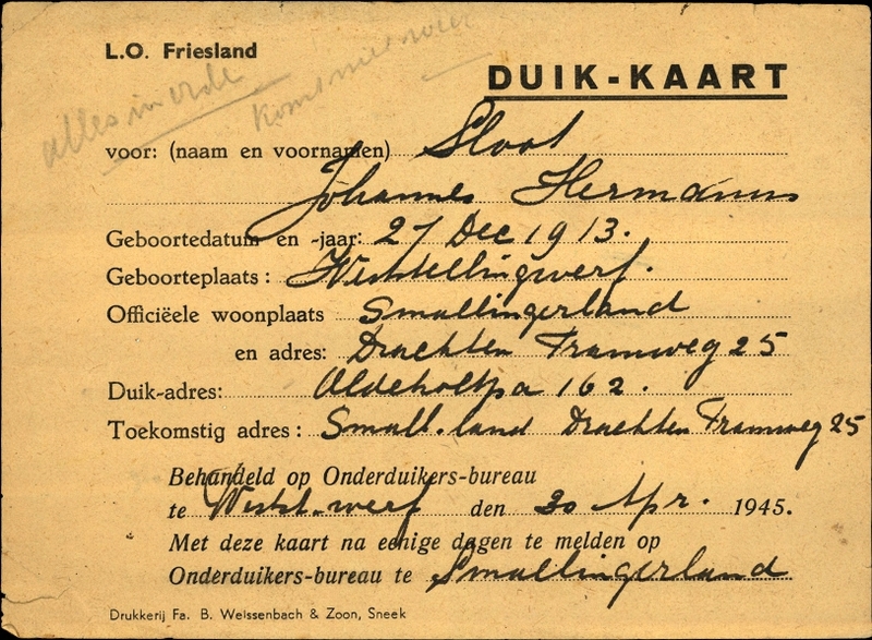 Onderduikinschrijving van Johannes Hermanus Sloot