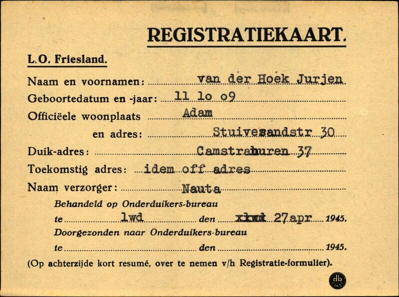 Duikadres: Camstraburen 37, - Oorspronkelijk adres: Stuyvesantstraat 30, Amsterdam - Reden onderduik: illegaal werk - Overige opmerkingen: Achterkant bijzonderheden: ondergedoken vanwege illegaal werk en A I gew. pap. - Achterkant beroep: kellner