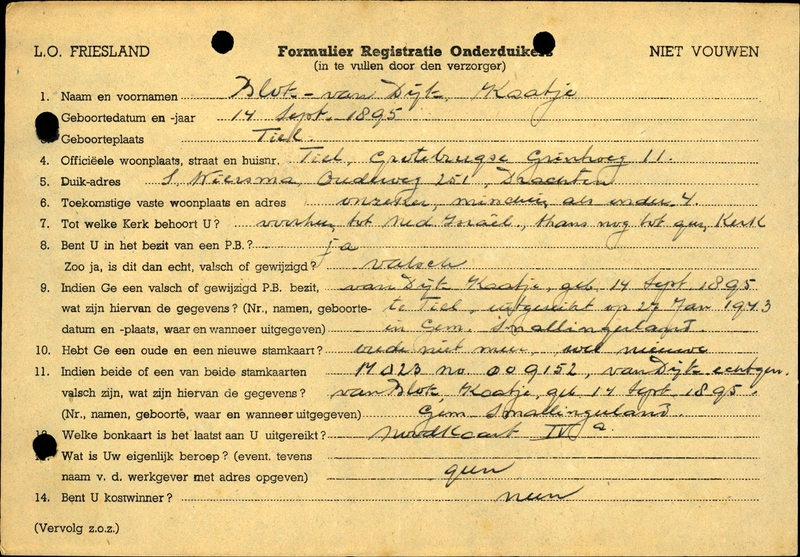 Duikadres: Oudeweg 251, Drachten - Oorspronkelijk adres: Grotebrugse Grintweg 11, Tiel - Reden onderduik: jodenvervolging