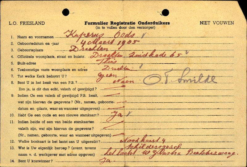 Duikadres: Zuidkade 65, Drachten - Oorspronkelijk adres: Zuidkade 65, Drachten - Reden onderduik: anderszins - Overige opmerkingen: Bijzondere opmerkingen: Met potlood bijgeschreven: O.T. Smilde. Is uit Smilde ondergedoken.