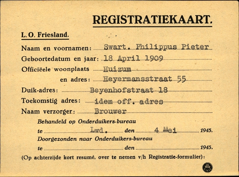 Onderduikinschrijving van Philippus Pieter Swart