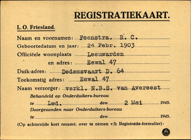 Duikadres: 64, Dedemsvaart - Oorspronkelijk adres: Eewal 47, Leeuwarden - Reden onderduik: arbeidsinzet - Overige opmerkingen: Achterkant beroep: horlogemaker-opticien