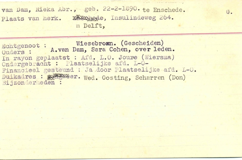 Duikadres: Scharren, Scharsterbrug - Oorspronkelijk adres: Insulindeweg 264, Delft - Overige opmerkingen: Bijzonderheden: gescheiden van Wiesebron - Ouders: A. van Dam, Sara Cohen overleden - Financieel gesteund door Plaatselijke afd. L.O.