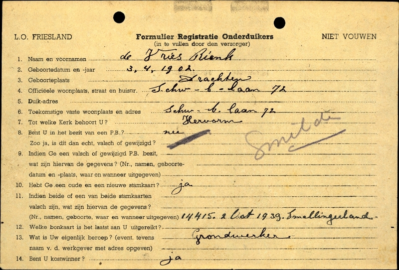 Onderduikinschrijving van Rienk de Vries
