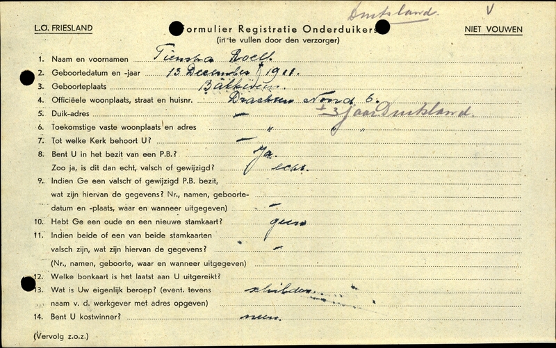 Onderduikinschrijving van Roelf Tienstra