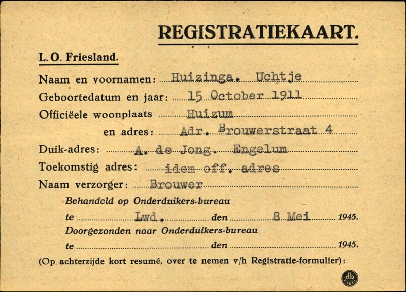 Duikadres: Engelum - Oorspronkelijk adres: Adriaen Brouwerstraat 4, Huizum - Reden onderduik: arbeidsinzet - Overige opmerkingen: Achterkant bijzonderheden: Duik-adres: A. de Jong - Achterkant beroep: Bankwerker