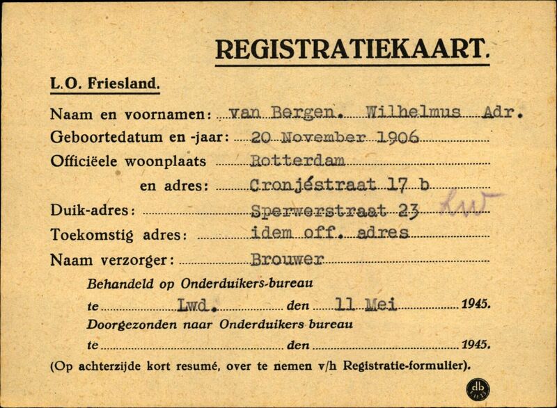 Onderduikinschrijving van Wilhelmus Adr. van Bergen