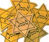 Jodenster. Nederland. Ongedragen. Zwarte jodenster op gele stof met centraal geplaatst het woord 'Jood', daarmee aanduidend dat dit een Nederlandse ster is. Bijzonder is het dat deze ster niet is uitgeknipt. De ster is gedrukt op een vierkant stukje stof met om de contouren van de ster een stippellijn gedrukt. Op deze stippellijn zou de ster dus uitgeknipt moeten worden alvorens op een kledingstuk ...